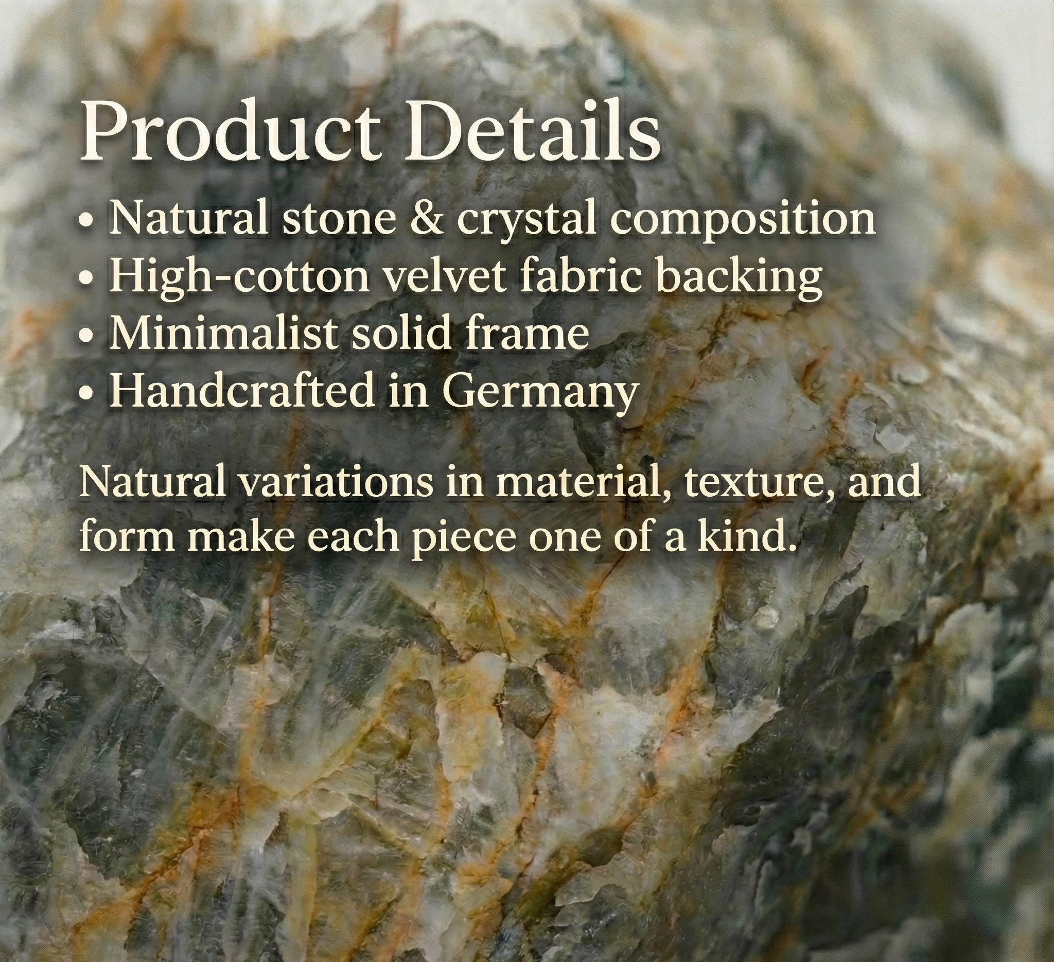 A small number of works include either surface-enhanced natural stones or intentionally human-made materials. These distinctions are always disclosed with transparency.